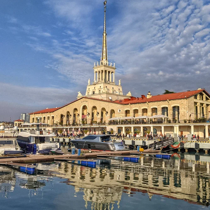 ⭑⭑⭑⭑⭑ Очень приятное расположение — фактически центр, и все под боком: парки, море, олимпийские объекты, вид из окна шикарный. Очень порадовало, что территория по пропускам, есть бассейны и места для загара с лежаками.